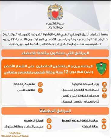 وفقاً لاعتماد الفريق الوطني الطبي لآلية الإشارة الضوئية (المرحلة البرتقالية) خلال إجازة وقفة عرفة وأيام عيد الأضحى المبارك من الاثنين الموافق 19 و لغاية الخميس الموافق 22 يوليو 2021م، سوف تتخذ إدارة النادي الإجراءات اللازمة كما هو مبين في الصورة المرفقة .
