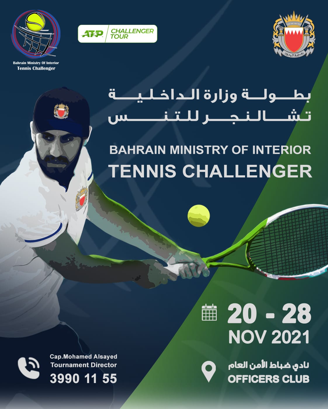 تستضيف مملكة البحرين منافسات بطولة وزارة الداخلية "تشالنجر" للتنس والتي ستقام على ملاعب نادي الضباط خلال الفترة من 20 لغاية 28 نوفمبر القادم، والتي ينظمها الاتحاد الرياضي للأمن العام بالتعاون مع النادي، وتشهد البطولة مشاركة مصنفين عالميين ضمن منافساتها، بمشاركة 32 لاعباً على المستوى الفردي للأدوار الرئيسية و16 لاعباً للأدوار التمهيدية و16 لاعباً على مستوى الزوجي، وسيتم إجراء قرعة تصفيات البطولة وتسجيل المشاركين في 19نوفمبر2021م، على ان تقام مباريات التصفيات التمهيدية في 21و22 نوفمبر، ومن ثم يتم إجراء قرعة الأدوار الرئيسية لتنطلق البطولة في 22نوفمبر، وسيتم نقل جميع المباريات على الهواء مباشرة في موقع البطولة، مما يتيح الفرصة للجماهير لمتابعة المنافسات التي ستقام على مدى 8أيام متتالية.