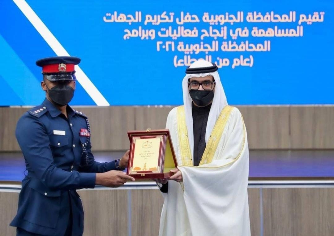 سمو الشيخ خليفة بن علي بن خليفة آل خليفة محافظ المحافظة الجنوبية بتكريم نادي الضباط نظير اسهاماته في نجاح فعاليات المحافظة الجنوبية وذلك خلال حفل التكريم للرعاة والمساهمين لفعاليات المحافظة الجنوبية للعام ٢٠٢١م و بالنيابة عن مدير النادي تسلم الدرع النقيب طارق أدريس أدريس رئيس شعبة البرامج والانشطة ، وقد اقيم الحفل صباح اليوم الأثنين الموافق ٢٧ديسمبر٢٠٢١م في الصالة الرياضية بنادي الضباط.