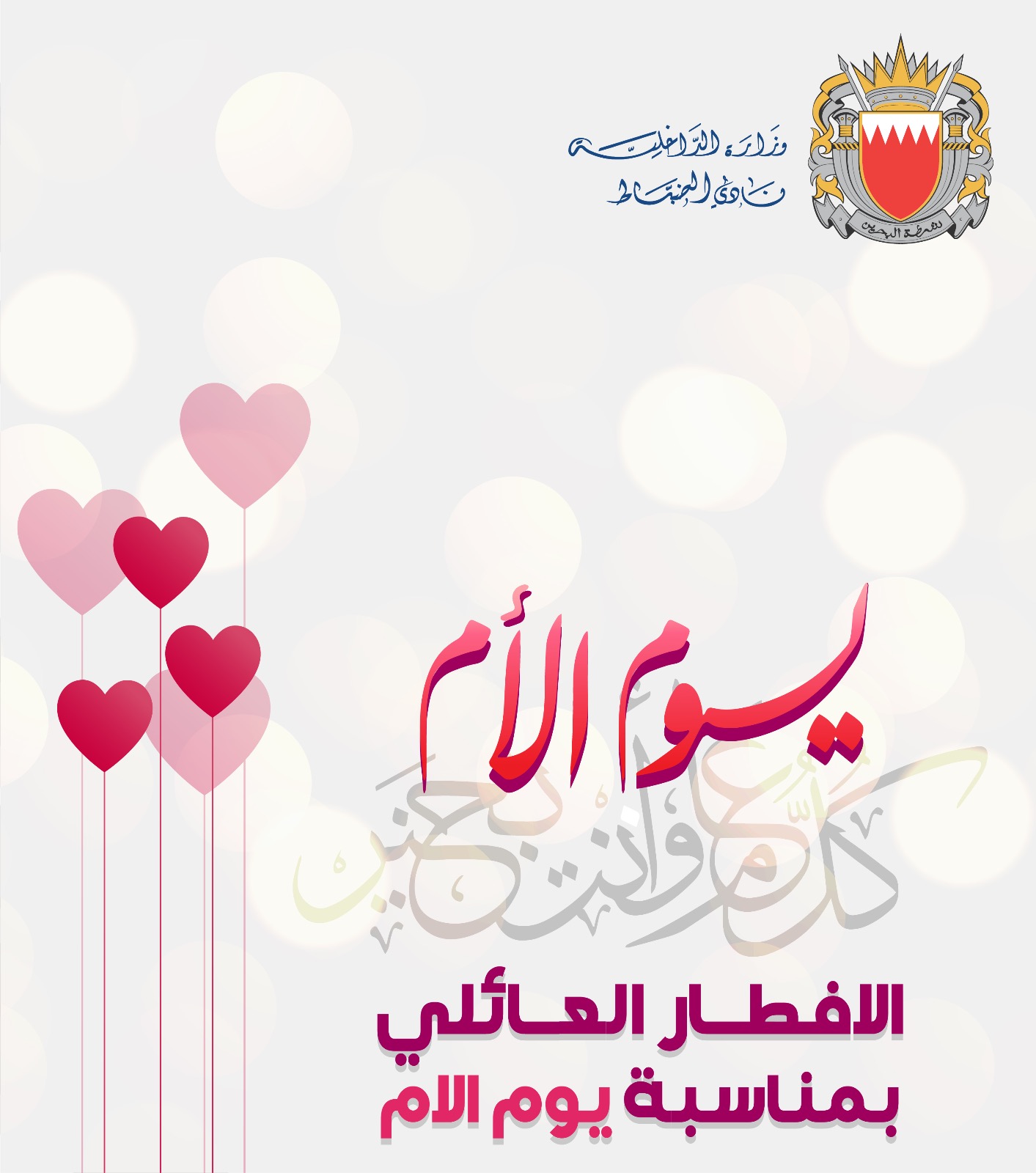 ينظم نادي الضباط بمناسبة يوم الام افطار لأعضائه و عوائلهم و ضيوفهم الكرام ، حيث يشتمل على تشكيلة من الاطباق البحرينية والعربية والعالمية في المطعم الايطالي بالنادي، ذلك في يوم السبت الموافق 19مارس2022م من الساعة 0800 ولغاية الساعة 1100.