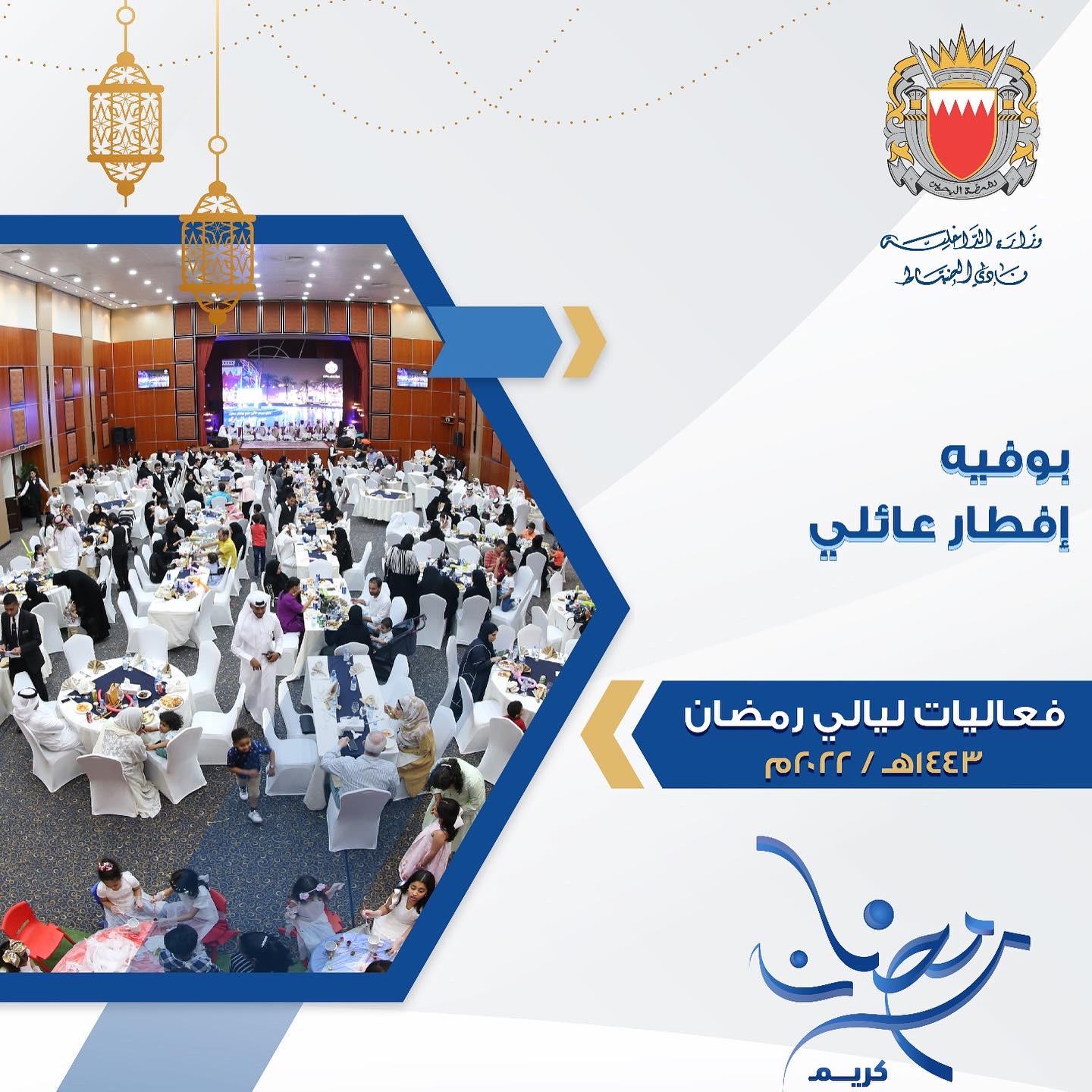 ضمن فعاليات ليالي رمضان 1443هـ/2022م يعلن نادي الضباط للسادة أعضائه وعوائلهم وضيوفهم الكرام عن إقامة بوفيه إفطار في يوم الخميس الموافق 14ابريل2022م من الساعة 1800 حتى 2000 في الصالة الرياضية بالنادي.