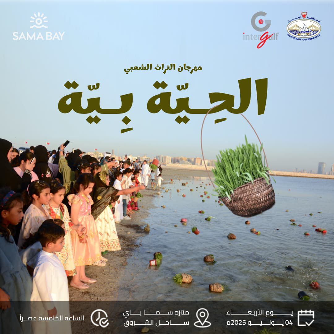 يسر نادي الضباط الإعلان بأن محافظة المحرق سوف تقيم مهرجان التراث الشعبي “الحية بية”، وذلك في يوم الأربعاء 04 يونيو 2025، في تمام الساعة الخامسة مساءً، في ساحل الشروق في منتزه سما بي بالمحرق.