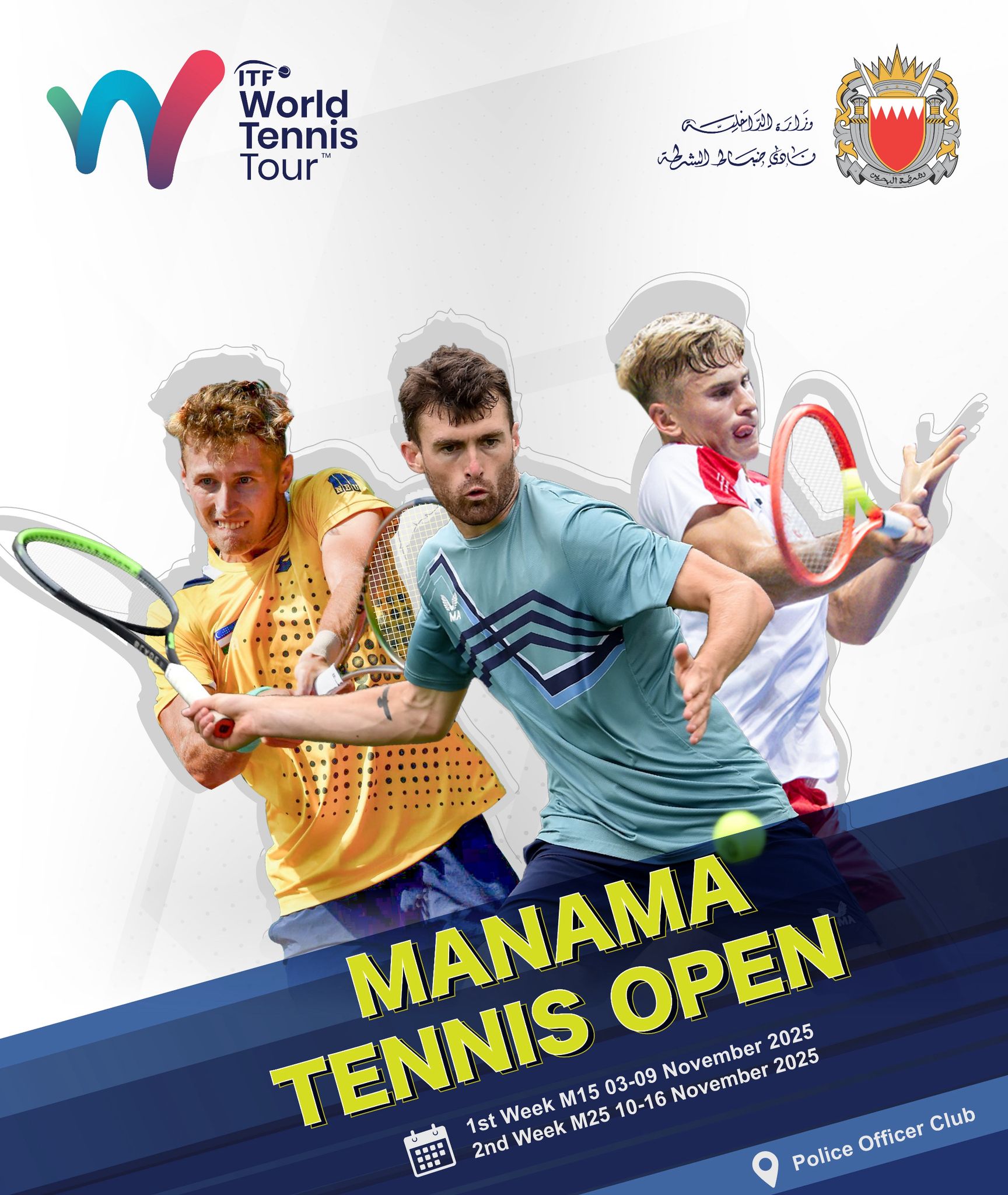 يعلن نادي ضباط الشرطة للسادة الأعضاء عن استضافة مجمع ملاعب التنس في النادي لبطولة Manama Tennis Open، والتي يُنظمها الاتحاد البحريني للتنس بالتعاون مع اللجنة الدائمة للتنس بوزارة الداخلية. خلال فترتين: من 2 وحتى 9 نوفمبر، و من 10 وحتى 16 نوفمبر، و التي تنطلق يوميًا في تمام الساعة 11 صباحًا. وعليه يدعو النادي السادة الاعضاء وضيوفهم الكرام للحضور والاستمتاع بمباريات البطولة.